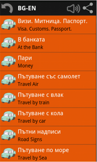 Можете да чуете всеки английски израз, чрез използване на стандартния TTS (ако е инсталиран) на вашия телефон. Научете основни фрази на английски, необходими за пътуването. С този разговорник ще бъдете уверени във всяка ситуация.