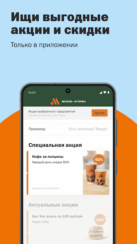 Profiteer van kortingen die alleen beschikbaar zijn voor app-gebruikers. Binnenin vind je geweldige deals op je favoriete gerechten: burgers, snacks, combo's, drankjes en desserts. We werken de lijst met promoties regelmatig bij, zodat je altijd iets naar je smaak kunt vinden. Bijvoorbeeld 4 sappige Nuggets voor slechts 1 roebel!