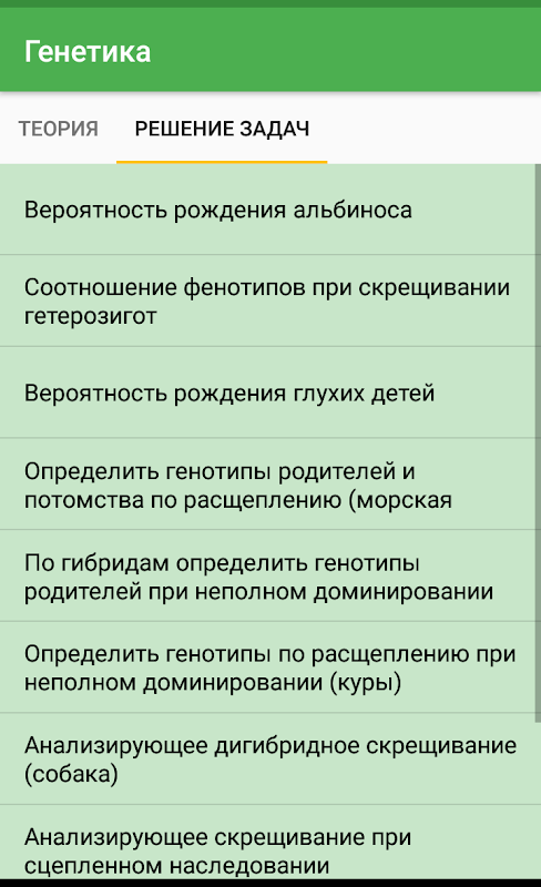 De applicatie bevat artikelen over genetica en tien problemen met de oplossing.