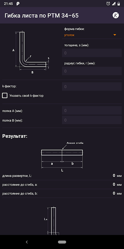 Berekening van de sweep voor het buigen van plaatmetaal volgens RTM 34-65. Berekening voor profielen met een buighoek van 90 graden: hoek, kanaal, C-profiel, G-profiel, S-profiel. Met het programma kunt u ook de waarde van de K-factor berekenen op basis van de meetresultaten.