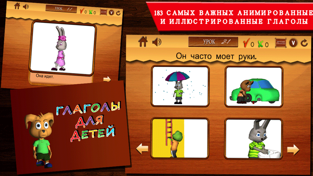 • содержит 183 анимированных и иллюстрированных наиболее распространенных и важных глаголов