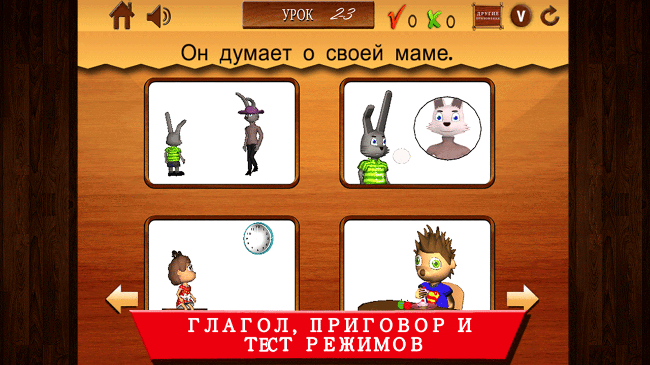 • существует возможность перейти в режим «глаголы», прервав урок в любое время, при этом звучит соответствующий глагол и появляется его написание