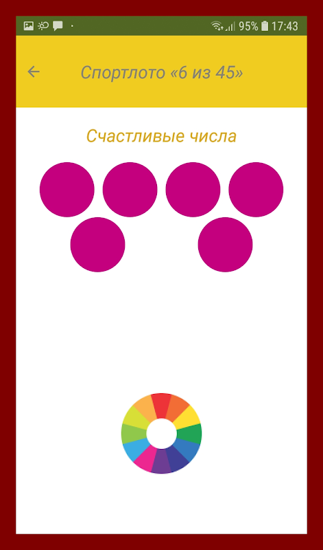 Dit is een handige en eenvoudig te gebruiken applicatie, zonder onnodige opties en instellingen. Kies de loterij waarin u geïnteresseerd bent, klik op de ronde knop gemaakt van veelkleurige strepen en ontvang een combinatie van geluksgetallen.