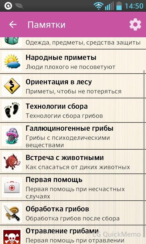 12. 11 nuttige herinneringen: "Tips voor beginners", "Wat u moet meenemen naar het bos", "Folk voortekens", "Oriëntatie in het bos", "collectie technologie", "hallucinogene paddestoelen", "Maak kennis met de dieren", "First Aid" "gedragsregels voor wapens opsporen ',' paddestoel behandeling", "Poison paddestoelen."