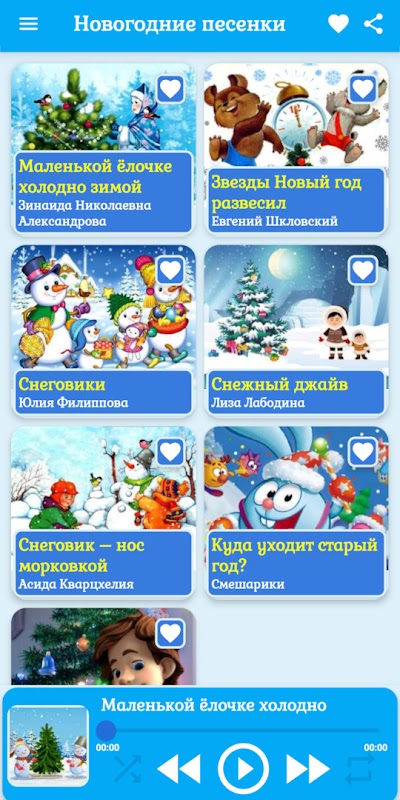 De muziekcollectie "New Year's Songs" bevat goede en geliefde stukken over de nieuwjaarswonderen en de kerstboom, grootvader Frost en Snegurochka, winter en, natuurlijk, Kerstmis.