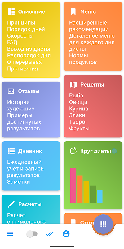U ontvangt een onmisbaar instrument in het gezicht van de applicatie te vinden, omdat het de meest relevante informatie voor elk van de dagen van het dieet verzamelde. Deze beschrijving van de algemene beginselen en uitvoeringsvoorbeelden van menu's en recepten en tal van andere nuttige informatie voor elke dag, die sterk wordt opgepikt, zodat u de gewenste resultaten kunt bereiken!