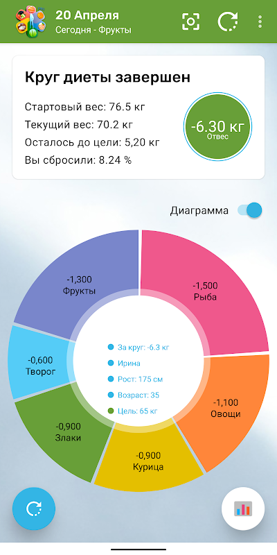 Ook met behulp van deze applicatie kunt u bijhouden van uw vooruitgang, en - als je verder komt in de voeding informatie over je prestaties zullen worden opgesteld in heldere visuele grafieken en tabellen, die alle nodige informatie wordt weergegeven - en het is allemaal helder en kleurrijk! Natuurlijk kun je je omgeving verrassen, trakteer jezelf en maak leuk om de juiste mensen)