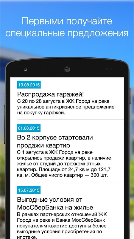 «Город на реке» – жилой квартал на севере Москвы. Демонстрационное мобильное приложение предназначено для покупателей недвижимости, которые ожидают постройки своего дома.