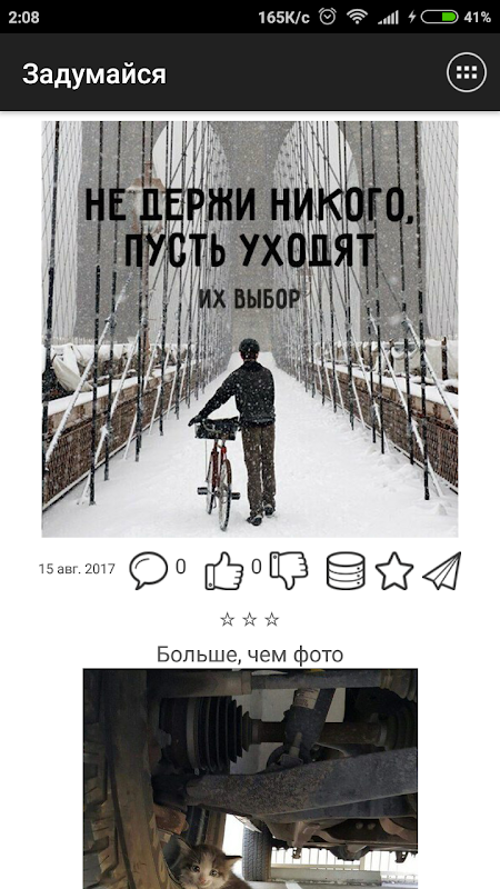 Понравившиеся записи можно комментировать и оценивать. Все понравившиеся картинки можно сохранять в галерее устройства в папке приложения. Ты можешь делиться записями с друзьями через социальные сети, а так же другие установленные на устройстве приложения. Ну и конечно, ты можешь оставлять лайки и сохранять записи в избранное.