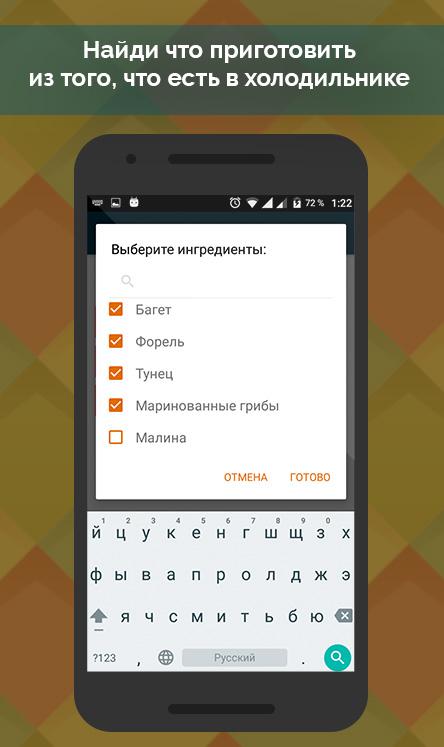 А может и этого не нужно будет делать! В приложении есть поиск по продуктам! Загляните в холодильник, выберите в приложении имеющийся продукты и программа найдет подходящие пошаговые фото рецепты с совпадением ингредиентов. Вам нужно будет только выбрать понравившиеся закуски для приготовления в домашних условиях.