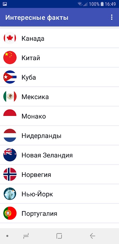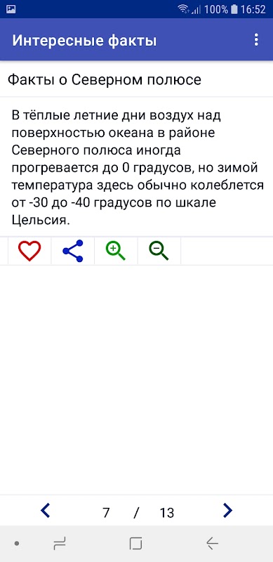 De applicatie bevat een groot aantal feiten over verschillende onderwerpen. Wil je weten welk land het grootste ter wereld is? Vraag je je af wat er zich in de diepten van de ruimte bevindt? En welke momenten in de wetgeving van verschillende staten zorgen voor een glimlach? Dit en nog veel meer vind je in de app Interessante Weetjes.