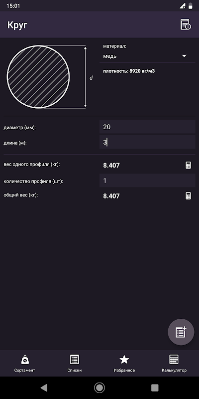 Met A kunt u ook de geschatte massa berekenen van ronde en gevormde buizen, vierkant, cirkel, blad / strip, zeshoek, hoek, kanaal en I-straal van willekeurige afmetingen van verschillende metalen. Volledig werken met de directory met materialen (toevoegen, bewerken, verwijderen en ook verbergen van materiaal dat niet wordt gebruikt).