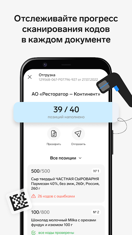 Installeer de applicatie op uw TSD als u dagelijks honderden codes moet scannen. Of op een smartphone als je met kleine volumes werkt. Wij ondersteunen Atol SMART.Lite, ATOL Smart.Prime en andere TSD.