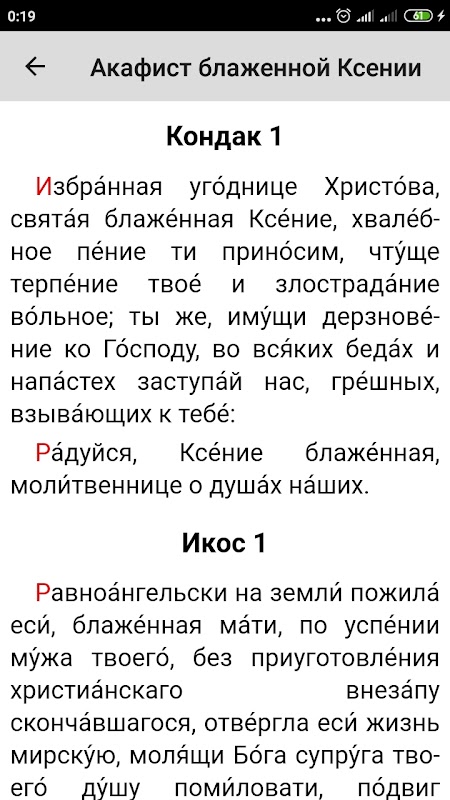 De applicatie bevat een akathist en een leven met wonderen van de gezegende Xenia van Petersburg. De gezegende Xenia van Petersburg is de beschermengel van Petersburg, een geliefde en alom gerespecteerde heilige, die van 26 tot 71 jaar zonder dak boven haar hoofd door de stad zwierf, mensen hielp en bad voor de redding van de ziel van haar echtgenoot , die zonder berouw stierf als gevolg van een plotselinge dood.