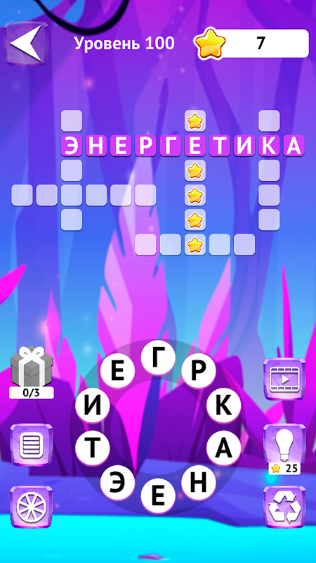 Het doel van het spel is om de verborgen woorden op het veld te vinden en zoveel mogelijk niveaus te voltooien om je beoordeling te verhogen. Van de gegeven letters moet je een woord maken door ze met een lijn te verbinden. Als het woord correct is geraden, worden de lege cellen ingevuld. Zodra het veld volledig gevuld is, is het level voltooid! Als je een woord vindt dat niet op het veld staat, wordt het toegevoegd aan de bonussen, waarvoor extra munten worden toegekend! De game heeft hints die je op moeilijke niveaus kunt gebruiken voor munten of het bekijken van advertenties. En voor degenen die geïnteresseerd zijn in het leren van de betekenis van nieuwe woorden, is er een woordenboek beschikbaar! Speel en verbeter je geest elke dag! Succes!