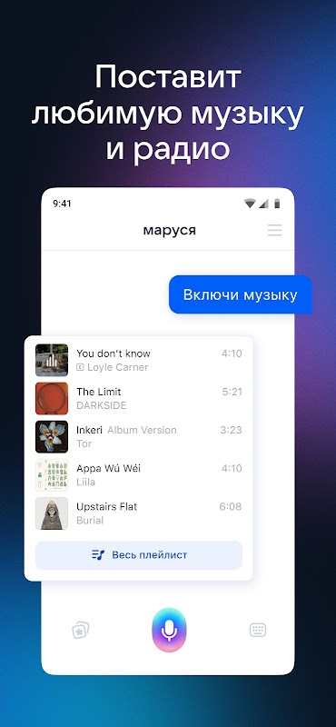 💭 Marusya, zet mijn afspeellijst aan. Je favoriete muziek en slimme aanbevelingen, selecties voor sport en ontspanning - de assistent vindt alle nummers voor je in de VK Music-service. Het kan ook de radio of aangename achtergrondgeluiden inschakelen.