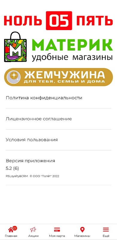Mobiele applicatie van de winkelketen "MATERIK", "ZERO FIVE", "PEARL"