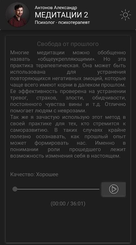 Het tweede nummer van het meditatieprogramma van Alexander Antonov, psycholoog-psychotherapeut. Nieuwe opnames openen vier technieken voor je: stemmingsverbetering, een plek van kracht, zelfliefde en diepe ontspanning. Ze zijn standaard ingesteld.