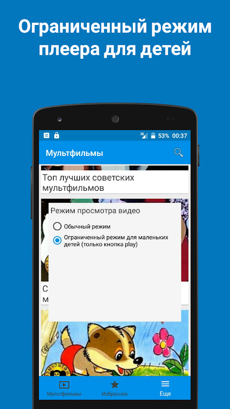 - ограниченный режим просмотра мультфильмов для детей, где ребенок не нажмет на что-то лишнее