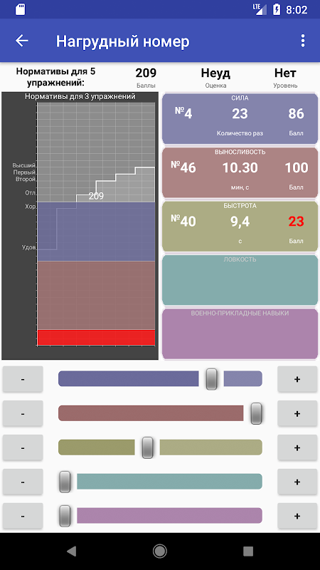 Данные о выполненных упражнениях и пройденных проверках можно просматривать списком, сортируя по названию, дате, баллам, либо в виде графика по выбранному упражнению или всем проверкам.