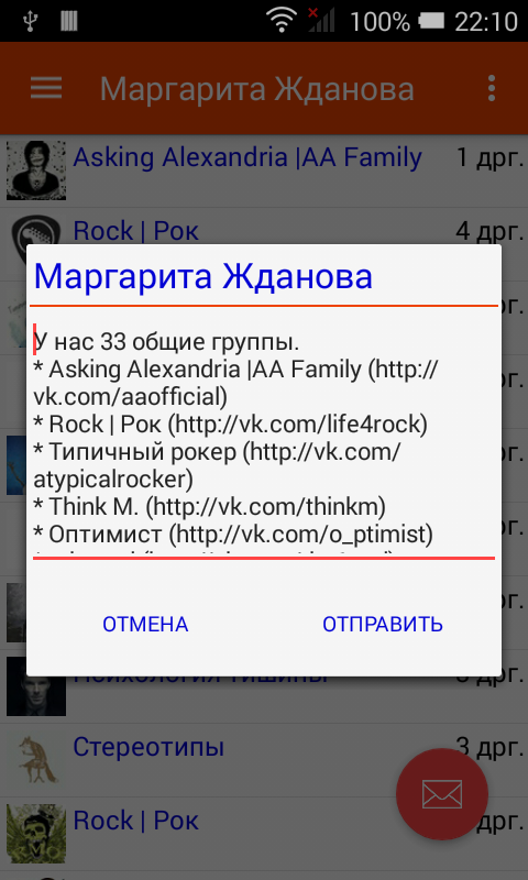 Есть возможность отправки другу сообщения о кол-ве общих групп. С развернутым списком групп. (Текст сообщения можно редактировать).