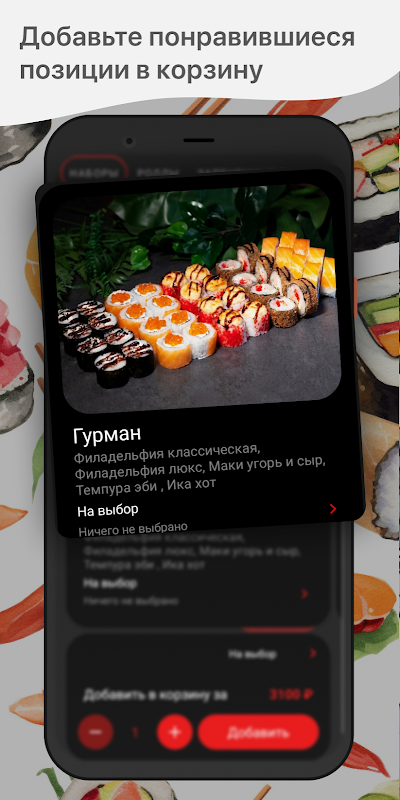 Zo plaatst u een bestelling in de “Okinawa”-applicatie: selecteer de artikelen die u leuk vindt in het menu, voeg ze toe aan uw winkelwagen en ga naar het afrekenscherm (door op het winkelwagenpictogram te klikken).