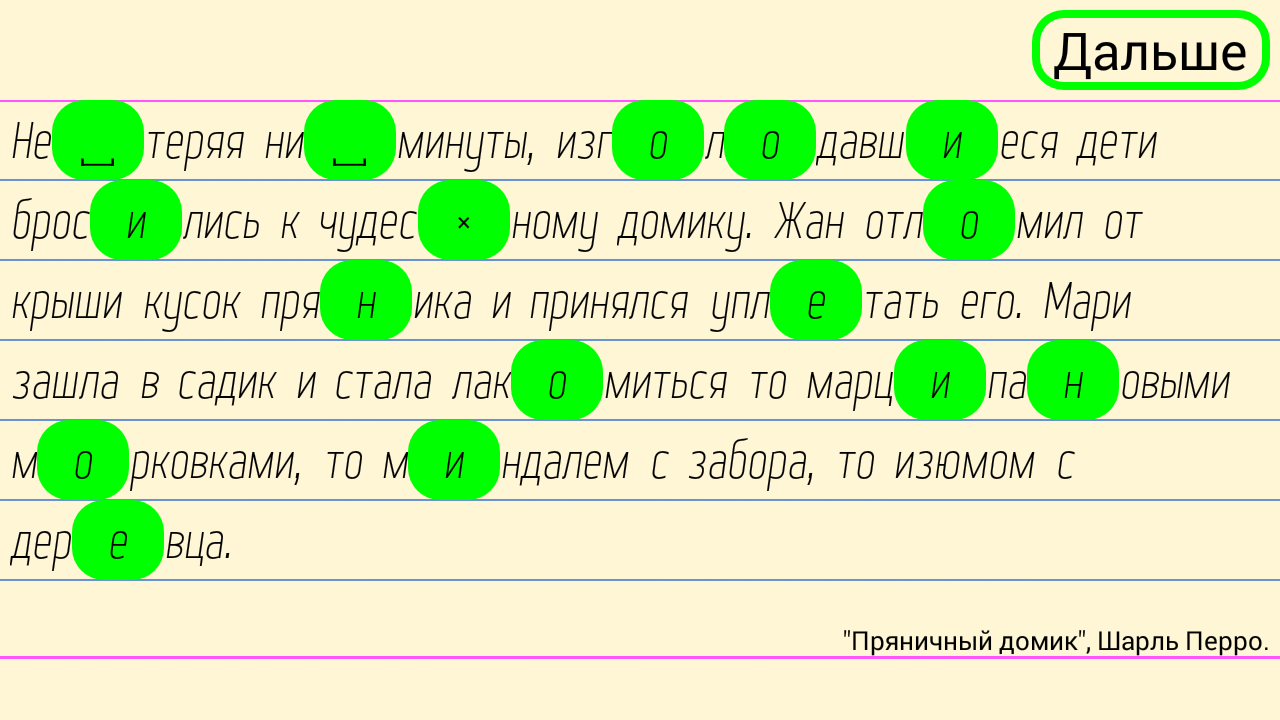 Het is vermeldenswaard dat de applicatie maakt gebruik van zinnen, uitdrukkingen, het zeggen van grote schrijvers, snaren van sprookjes, zo vertrouwd voor ons uit de kindertijd. Plaats de ontbrekende drive letters en je weet hoe sterk in de grammatica van de Russische taal.