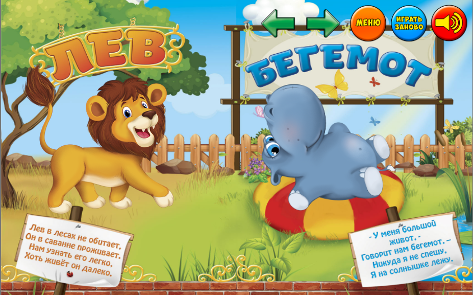 Игра содержит в себе 4 уровня сложности. Нужно пройти 3 уровня: «Жители зоопарка», «Домашние животные», «Лесные зверята» – и только тогда вам откроется самый интересный уровень, который познакомит вашего малыша с необычными зверюшками. В этом уровне животное нужно собрать: поставить носик, глазки, лапки.
