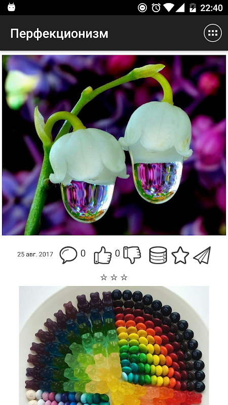 Понравившиеся записи можно комментировать и оценивать. Все понравившиеся картинки можно сохранять в галерее устройства в папке приложения. Ты можешь делиться записями с друзьями через социальные сети Facebook, Вконтакте, Одноклассники, Viber, WhatsApp а так же другие установленные на устройстве приложения. Ну и конечно, ты можешь оставлять лайки и сохранять записи в избранное.