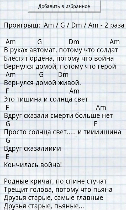 Если в Вашей компании есть место для гитары и душевных песен, то это приложение для Вас! Наше приложение - удобный армейский песенник с аккордами для гитары. Все песни расположены в алфавитном порядке и даже если Вы вдруг забыли, как называется композиция, то благодаря удобному поиску можно с легкостью ее найти.