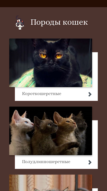 Породы котов бывают разными и их много, поэтому приложение поделено на разделы: