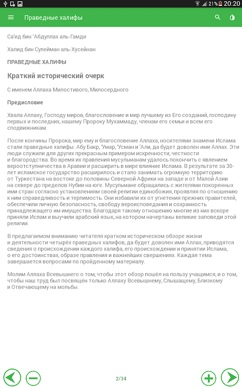 В предлагаемом вниманию читателя кратком историческом обзоре жизни и деятельности четырёх праведных халифов, да будет доволен ими Аллах, приводятся сведения о происхождении каждого халифа, его происхождении и принятии Ислама, о его достоинствах, образе правления и важнейших свершениях. Каждая тема завершается вопросами по пройденному материалу.