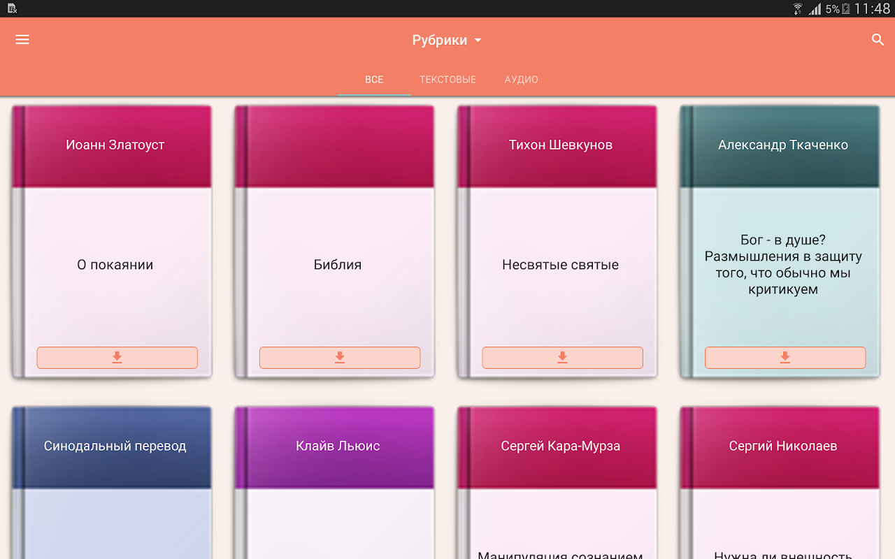 - возможность скачать всю библиотеку или отдельную рубрику на устройство и