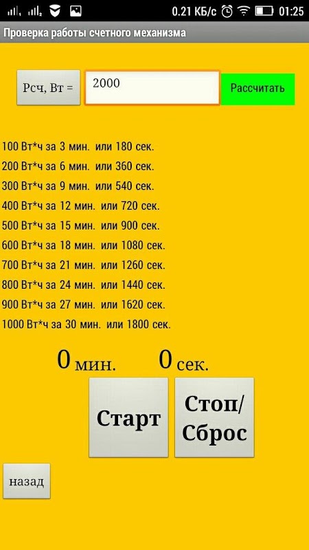 in de U in de drift waarde van de spanning gemeten door de voltmeter; in de I, en de input stroom wordt gemeten door een ampèremeter of klem meter. Na het klikken op de groene knop "Bereken Pseti" komt de berekening van de waarde netwerkcapaciteit. Vervolgens is de betalingscapaciteit van DMC's, waarbij rekening wordt gehouden el.schetchik. In de A, op (imp) kWh kies de overbrengingsverhouding meetinrichting. Klik op de knop "Start" en houd, komt de pols tijd, is waarvan het aantal opgeslagen in het n gebied van de (imp). Door op de groene knop "Bereken PSCh" berekende vermogen DMC. Door op de groene knop "rekenfout" wordt berekend met inachtneming van de fout van het instrument. Controle van de teller mechanisme wordt getest in een ander venster (controleren teller mechanisme). Door op de groene knop "DMC W 'in de waarde van de kracht venster verschijnt, die werd berekend in het vorige scherm (rekenfout in de doseerinrichting 1F. El.seti). Door op de groene knop "Estimate" berekening verschijnt. Het screenshot toont een voorbeeld, wat betekent dat gedurende 3 minuten. metering "wond" 100 Wh, op 2000 W belasting.