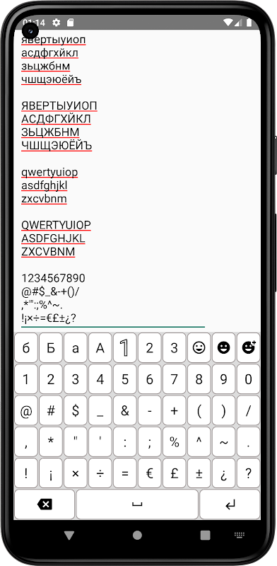 De applicatie bevat in totaal 10 verschillende lagen: Russisch onder, Russisch boven, Engels onder, Engels boven, cijfers en 3 algemene symbolen, 3 emoticons.