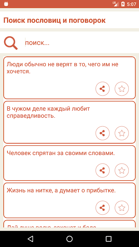 De applicatie stelt u in staat om te gebruiken als een categorisatie en trefwoord zinnen en logisch. Gevonden spreekwoorden en gezegden die u kunt toevoegen aan uw favorieten om snel te herinneren aan de verklaring van de belanghebbende in de toekomst van het hoofdmenu van de toepassing. Ook het programma kunt u het spreekwoord snel te delen in elke sociale netwerken. U kunt interessante spreekwoorden delen in een enkele klik in deze populaire sociale netwerken als VKontakte, Google+, Odnoklassniki, World of Mail.ru, in de boodschappers (WatsApp, Viber, Skype) en andere sociale programma's.