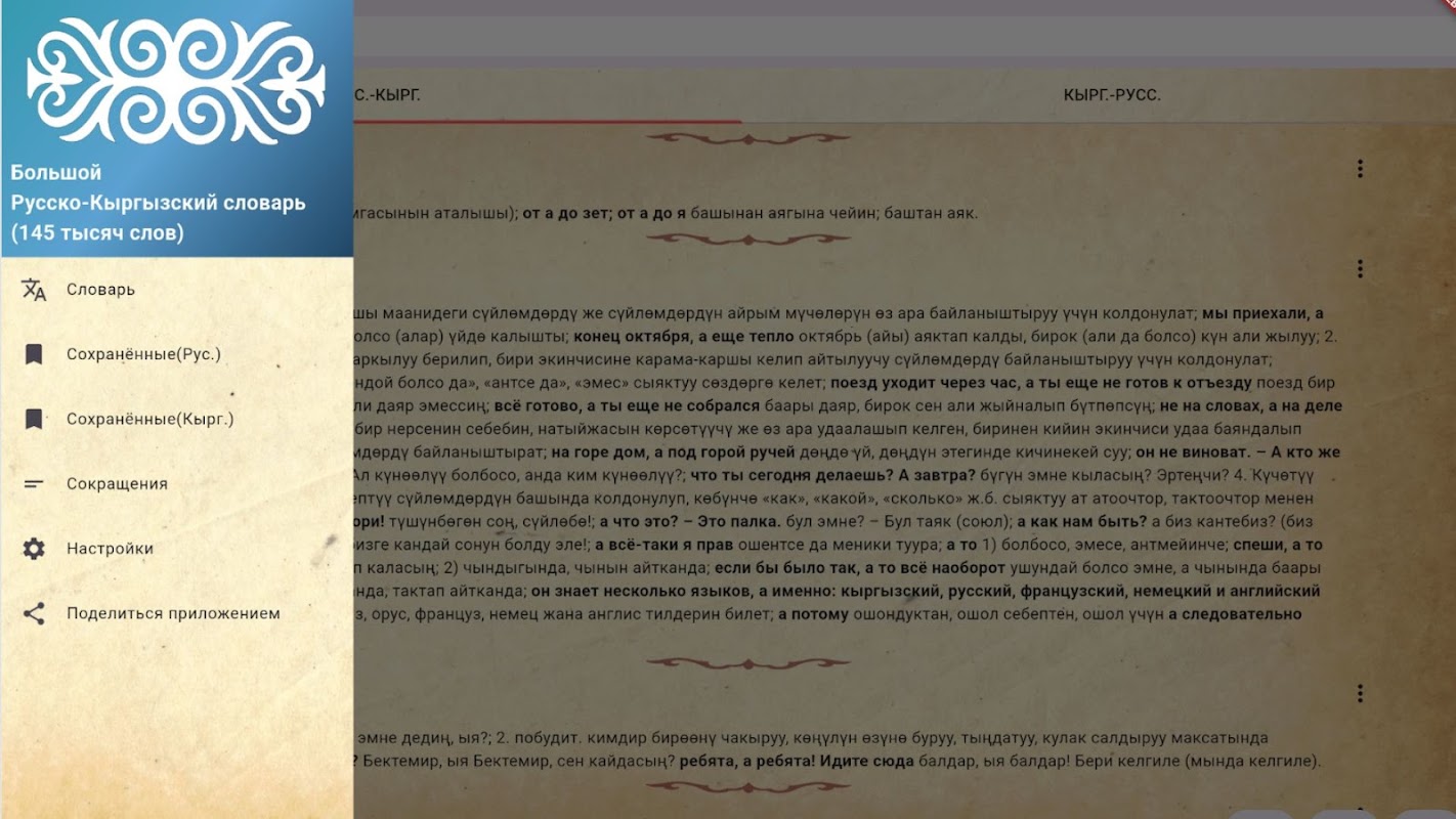 Het Grote Russisch-Kirgizische Woordenboek is een handige mobiele applicatie voor het vertalen en bestuderen van de Kirgizische en Russische taal.