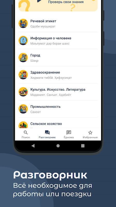 ✅ Farhang is een multifunctionele applicatie die een woordenboek, een Russisch-Tadzjiekse taalgids en een enkele (een verzameling regels voor de Tadzjiekse taal) combineert.