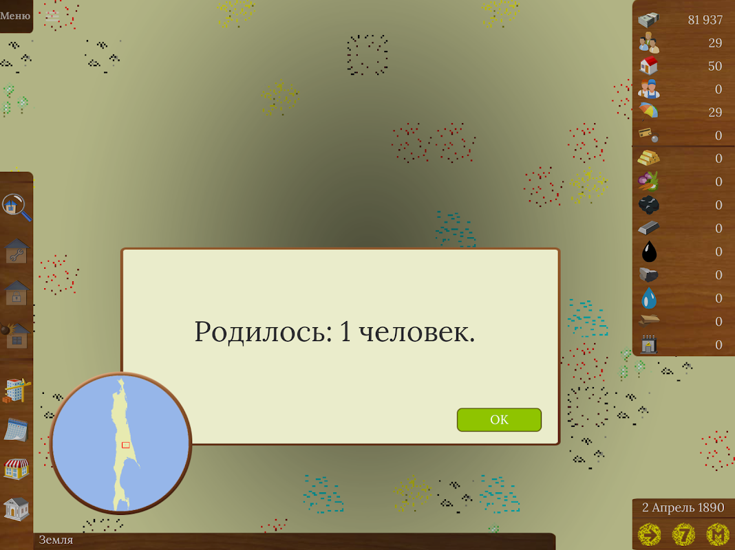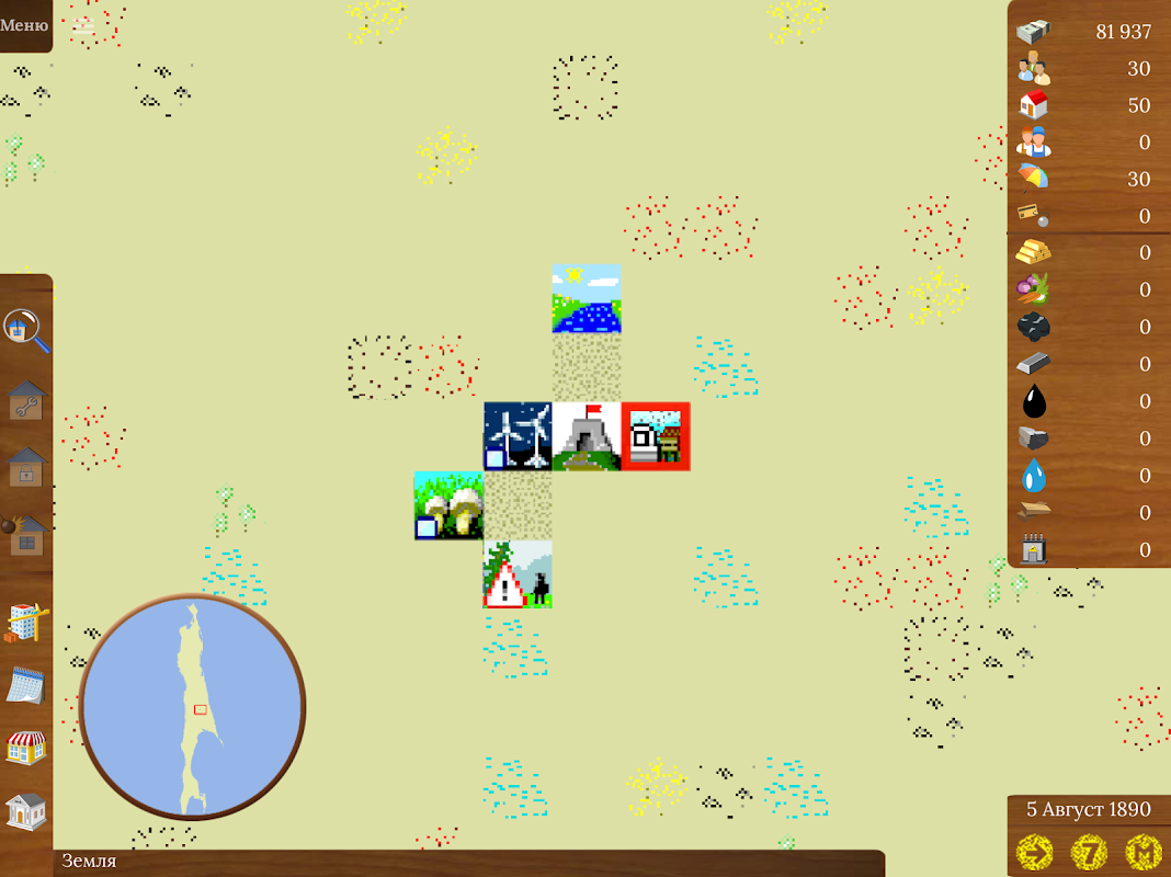 Вы можете создавать 33 вида строений.В некоторых клетках земли находятся определенные ресурсы (лес, вода, уголь и т.д.). Каждый день строения расходуют ресурсы и приносят прибыль. Некоторые строения могут работать только в определенные времена года.