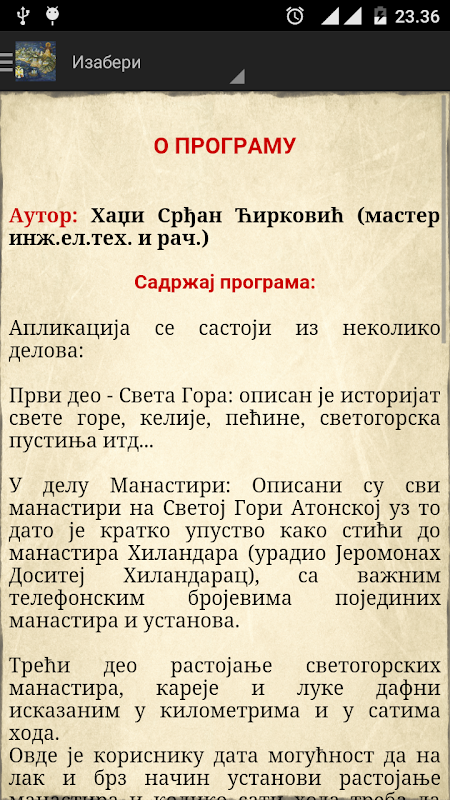 De applicatie is bedoeld voor iedereen, maar vooral voor mensen die naar de berg Athos reizen. Gewoon om als zakinformant te hebben. Om enkele elementaire basiszaken te weten over kloosters en de Heilige Berg, enz...