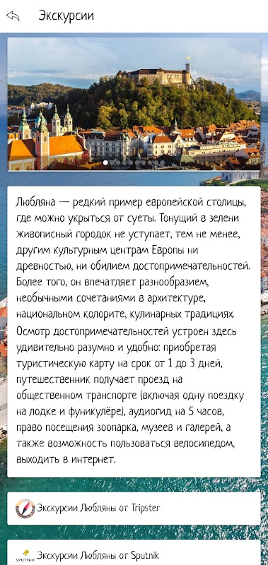 Tot voor kort werd Slovenië niet zozeer als een Europeaan als wel als een kuuroord in de hele Unie beschouwd, en vandaag is een nieuwe generatie Russische toeristen net begonnen deze route opnieuw onder de knie te krijgen. Behandeling op de lokale wateren geeft echt fenomenale resultaten, gezien de genereuze aard van deze regio, uitstekende mogelijkheden en jarenlange ervaring in de behandeling van verschillende ziekten. Voeg toe aan deze ongelooflijke natuurlijke schoonheid, een interessante excursie, goed verzorgde stranden, een keuken, die enigszins doet denken aan Russische en Slavische open zielen en harten van lokale bewoners. Er is een situatie dat je alleen of met z'n tweeën reist en je wilt een interessante excursie maken, maar het is duur, omdat de gids een groepstarief in rekening brengt. In deze applicatie kunt u medereizigers vinden voor gezamenlijke excursies en de kosten van de tour verlagen. Publiceer uw bericht in het gedeelte "Medereizigers" van de applicatie en het zal zichtbaar zijn voor andere gebruikers van de applicatie binnen een straal van 10 kilometer. En als u op het "geolocatie"-icoontje klikt, ziet u zelf nog meer van dergelijke aanbiedingen binnen een straal van 10 kilometer van u af! Bovendien kunt u in de applicatie een eerste kennismaking maken met de steden van Slovenië, een plaats kiezen om te reizen door de bezienswaardigheden en videorecensies te bekijken. De applicatie bevat ook informatie over reisbureaus, reisbureaus en hotels die hun diensten aanbieden in de geselecteerde stad.