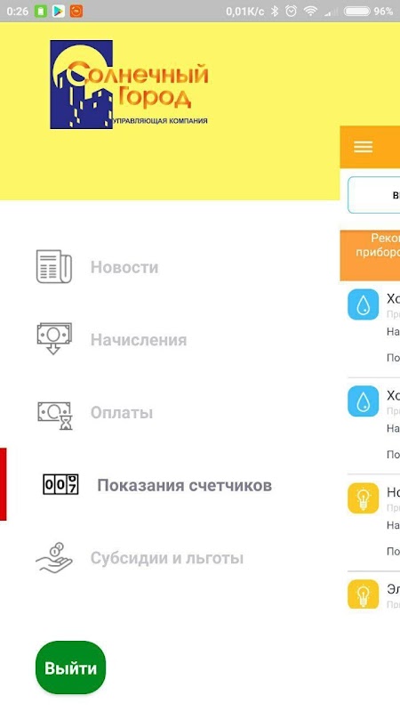 Приложение позволяет просматривать новости, начисления, оплаты, субсидии по лицевому счету и передавать показания счетчиков через мобильное устройство.