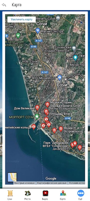 In deze applicatie kun je een eerste kennismaking met de stad Sochi maken, een plaats kiezen om te reizen door de bezienswaardigheden en videorecensies te bekijken. Ook in de applicatie is er informatie over excursiebureaus en hotels die hun diensten aanbieden in Sochi.