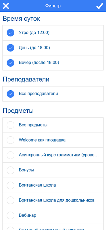 Mobiele applicatie voor studenten van de Welcome Language Studio in St. Petersburg.
