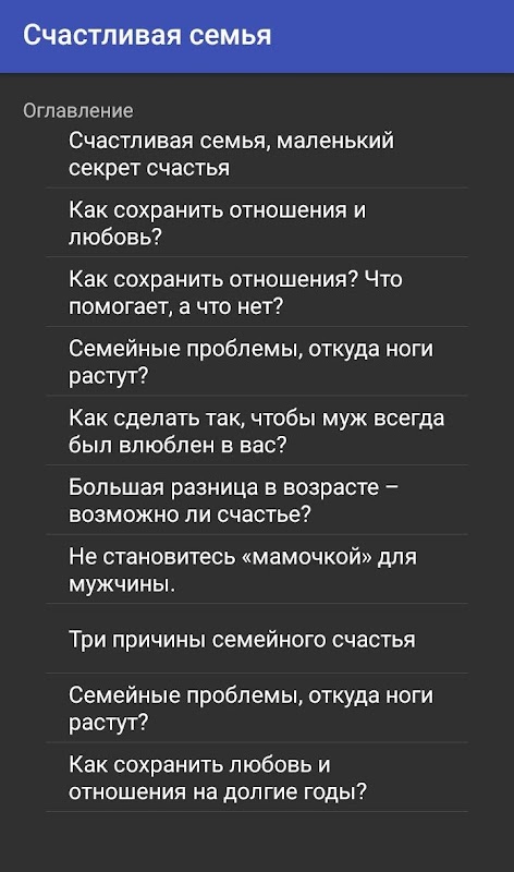 Приложение дает советы о том, как сделать брак счастливым на долгие годы, о том как переносить ссоры и идти на пути к общей цели.