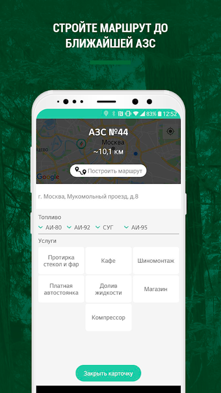 • получать информацию о реализуемых видах топлива, ценах и услугах на станциях;