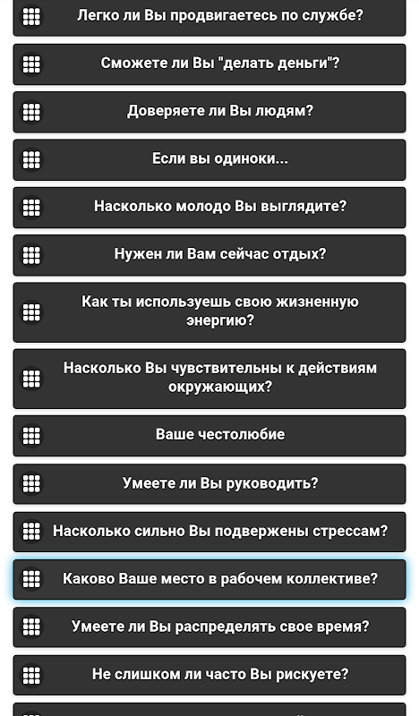 Приложение позволит вам пройти популярные психологические тесты с автоматическим подсчётом результатов. Хотите узнать каковы ваши психологические особенности? для этого пройдите не сложные и быстрые тесты по психологии прямо сейчас. Результат тестов вы получаете совершенно бесплатно. Узнавайте больше о себе и ваших близких, разбирайтесь в отношениях со своей второй половинкой. Психологические тесты - это доступный способ определения черт вашего характера, поведения, свойств личности, способностей конкретного человека, особенностей взаимоотношений между людьми. Тесты позволяют увидеть себя по-новому, посмотреть со стороны и заглянуть внутрь себя. В приложении собрано большое количество психологических тестов, проходя их узнавайте новое о себе.