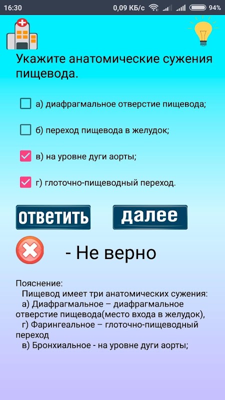 Приложение "Тест по анатомии" поможет подготовиться не только к модулям, но и к экзамену. Процесс получения знаний сопряжен с непосредственным применением их на практике, в тесте, что позволяет повысить качество знаний студентов-медиков.