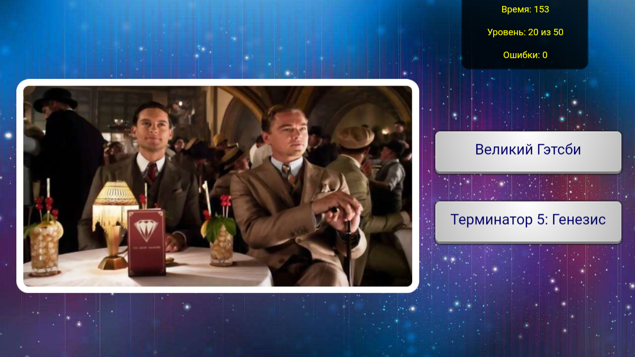Вам будет дана 1 картинка из фильма вы должны будете выбрать 1 верный вариант из 2 предложенных. За неверный ответ будет начисляться время 5 секунд к вашему таймеру, поэтому у вас будет стимул чтобы не ошибиться и пройти все уровни без ошибочно, после вы можете просмотреть свой рейтинги и узнать вашу оценку о знании киноленты. Играйте еще раз, чтобы увеличить количество сыгранных игр в рейтинге и выйти на новый уровень эрудиции в знаниях различных фильмов!