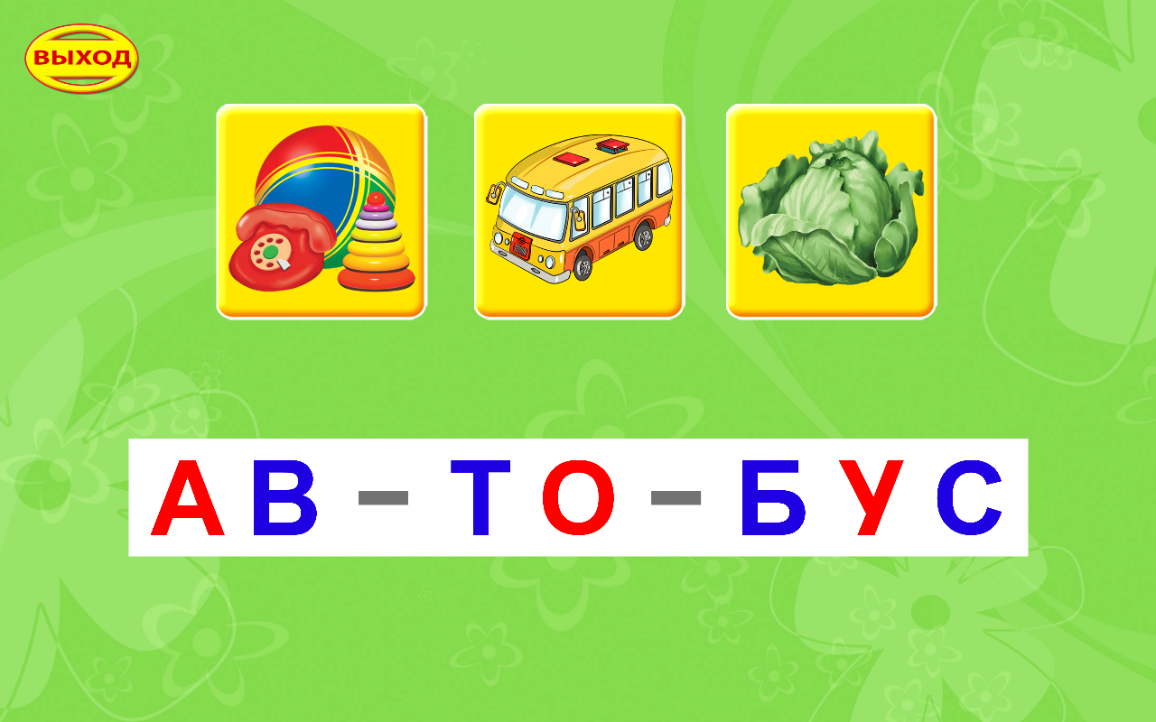 Aanvraag voor het leren om woorden te lezen. Op het scherm van het kind ziet het woord, die is verdeeld in lettergrepen, en drie foto's, waarvan er één illustreert de betekenis van het woord. Kind moet het woord te lezen en klik op de juiste afbeelding. Woorden toepassing zijn gerangschikt in volgorde van toenemende moeilijkheidsgraad lezen. Eerst zijn er woorden die uit twee lettergrepen geopend, dan woorden met één gesloten lettergreep. Verdere kenmerken woord dat bestaat uit drie lettergrepen en lettergrepen, etc. De rood gemarkeerde klinkers, blauw - .. Hard medeklinkers, en groen - zachte medeklinkers. Geleidelijk aan het verplaatsen van de meer eenvoudige tot complexe woorden, zal het kind leren om snel de woorden met verschillende soorten lettergrepen te lezen.